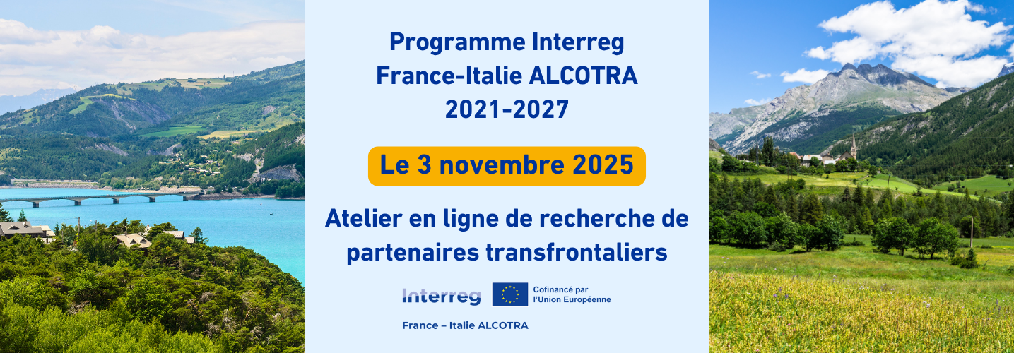 Dans le cadre du programme Interreg ALCOTRA France-Italie 2021-2027, et en partenariat avec l’Autorité de gestion et les administrations partenaires, les animateurs du programme ont le plaisir d’annoncer l’organisation d’un atelier en ligne de recherche de partenaires transfrontaliers.